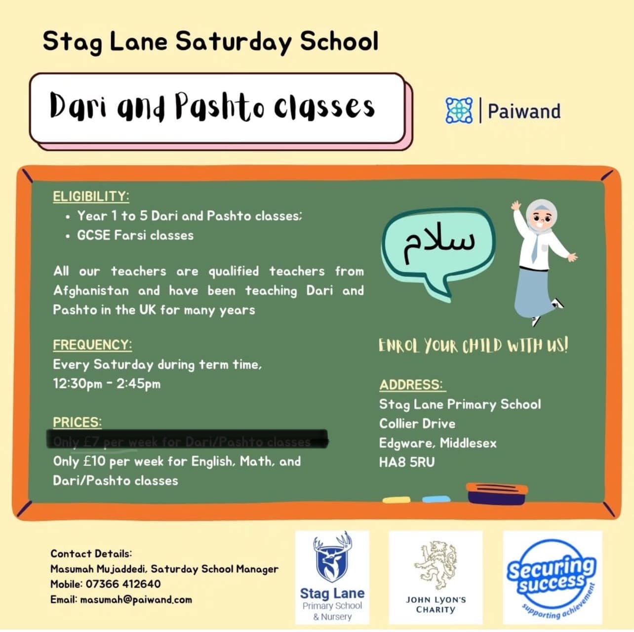 The Stag Lane Saturday School, run by Afghan Association Paiwand, provides high-quality supplementary education for children aged 5–11. Operating from Stag Lane Primary School, it supports pupils in English and Maths while promoting bilingualism through Dari and Pashto language classes and cultural studies.
